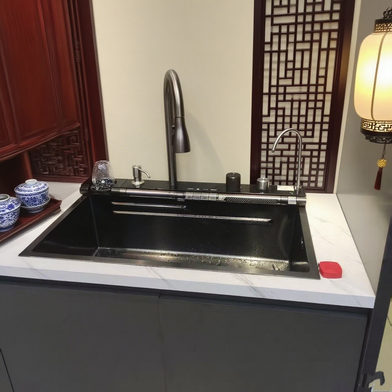 High-Arc Faucet Double-Bowl Kitchen Sink 900*550*230mm Large-angle water outlet